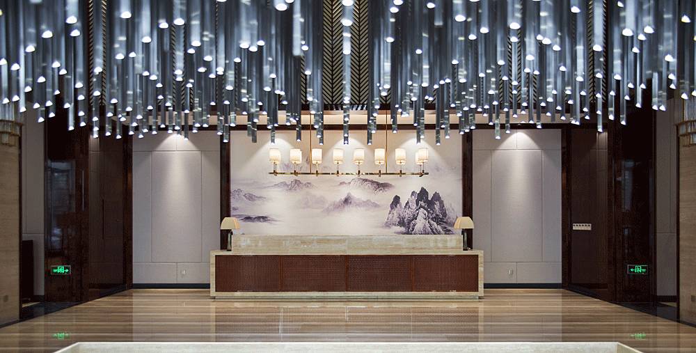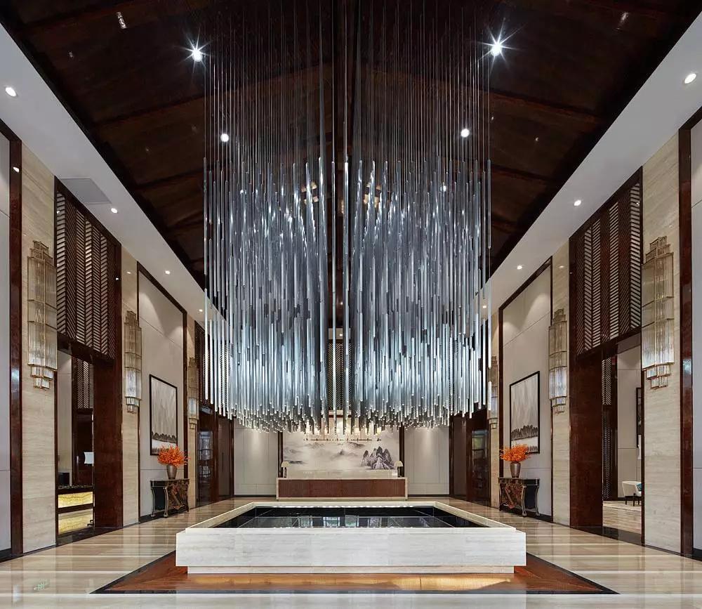 進入大堂中心,便被一個奪人眼目的裝置藝術(shù)吸引,數(shù)百根不銹鋼條垂吊而下,宛如瀑布“飛流直下三千尺,疑是銀河落九天”,成為整個空間的視覺焦點,啟動后,水珠從不銹鋼滴落到地景的水中,呈現(xiàn)出“大珠小珠落玉盤”的動感。