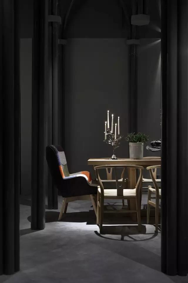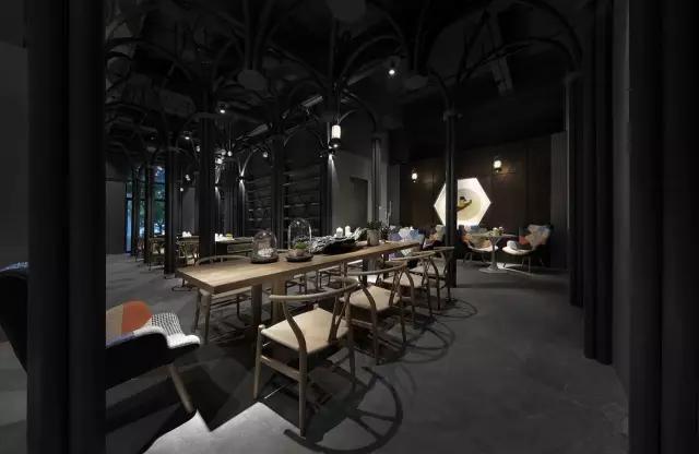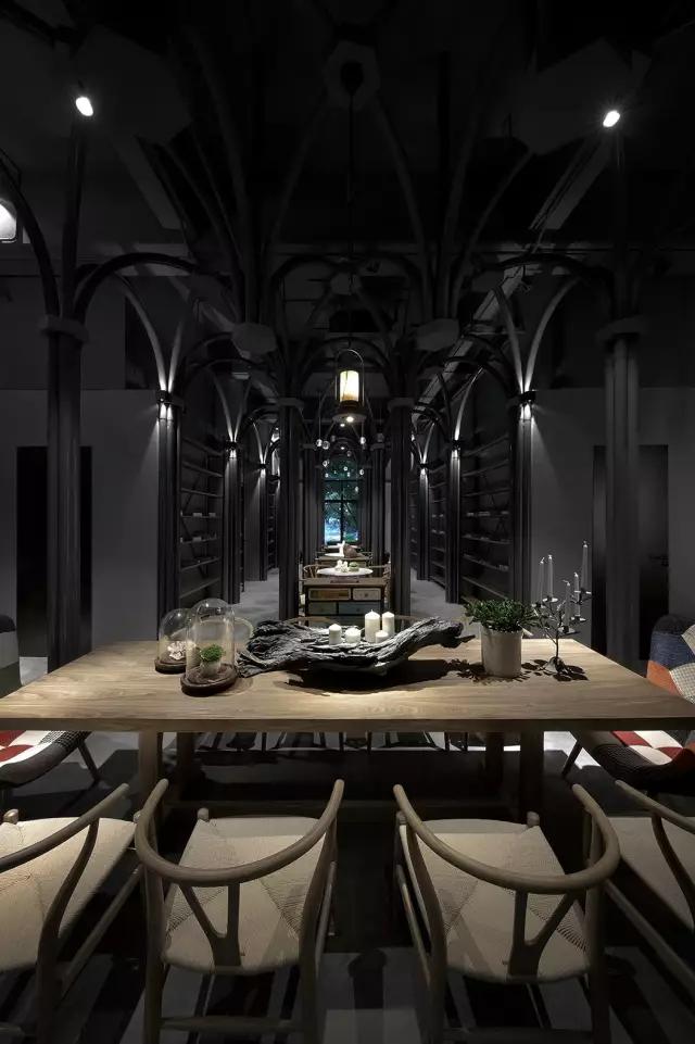 原建筑空間剛剛結(jié)束了破敗的工業(yè)廠房的狀態(tài),業(yè)主接手時還是一片狼藉。項目的運營團隊希望打造集餐飲區(qū)、咖啡區(qū)、音樂活動區(qū)及一個塔羅牌活動區(qū)為一體的復(fù)合空間。設(shè)計團隊從項目的主題概念中所散發(fā)的神秘色彩入手,希望在偏精神層面的建筑中汲取靈感,翻閱并走訪了大量的哥特式建筑,從挺拔向上的建筑空間結(jié)構(gòu)中體會與神對話的力量感,然后將其移植到這個項目中,以當代的構(gòu)成形式,向傳統(tǒng)建筑致敬。